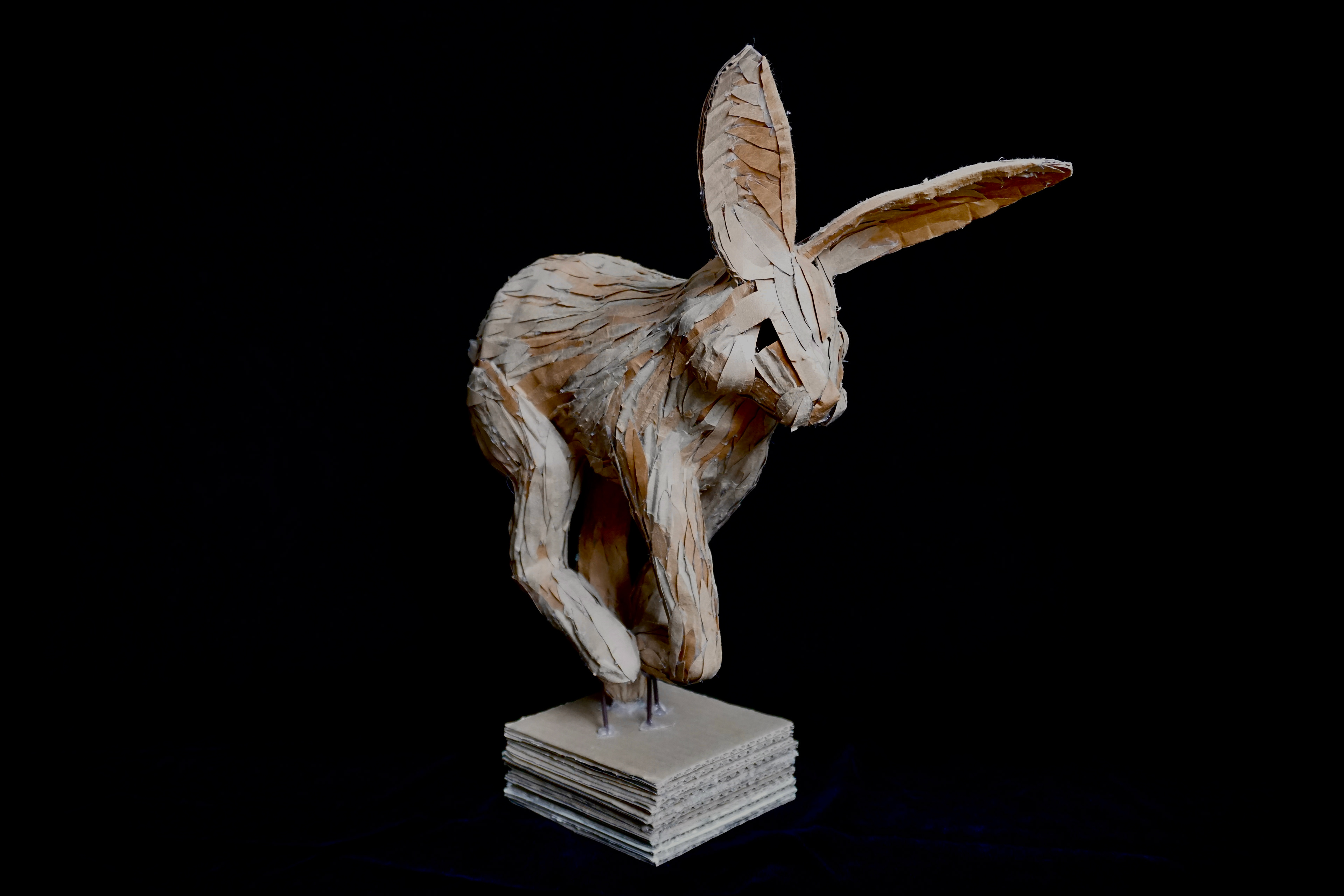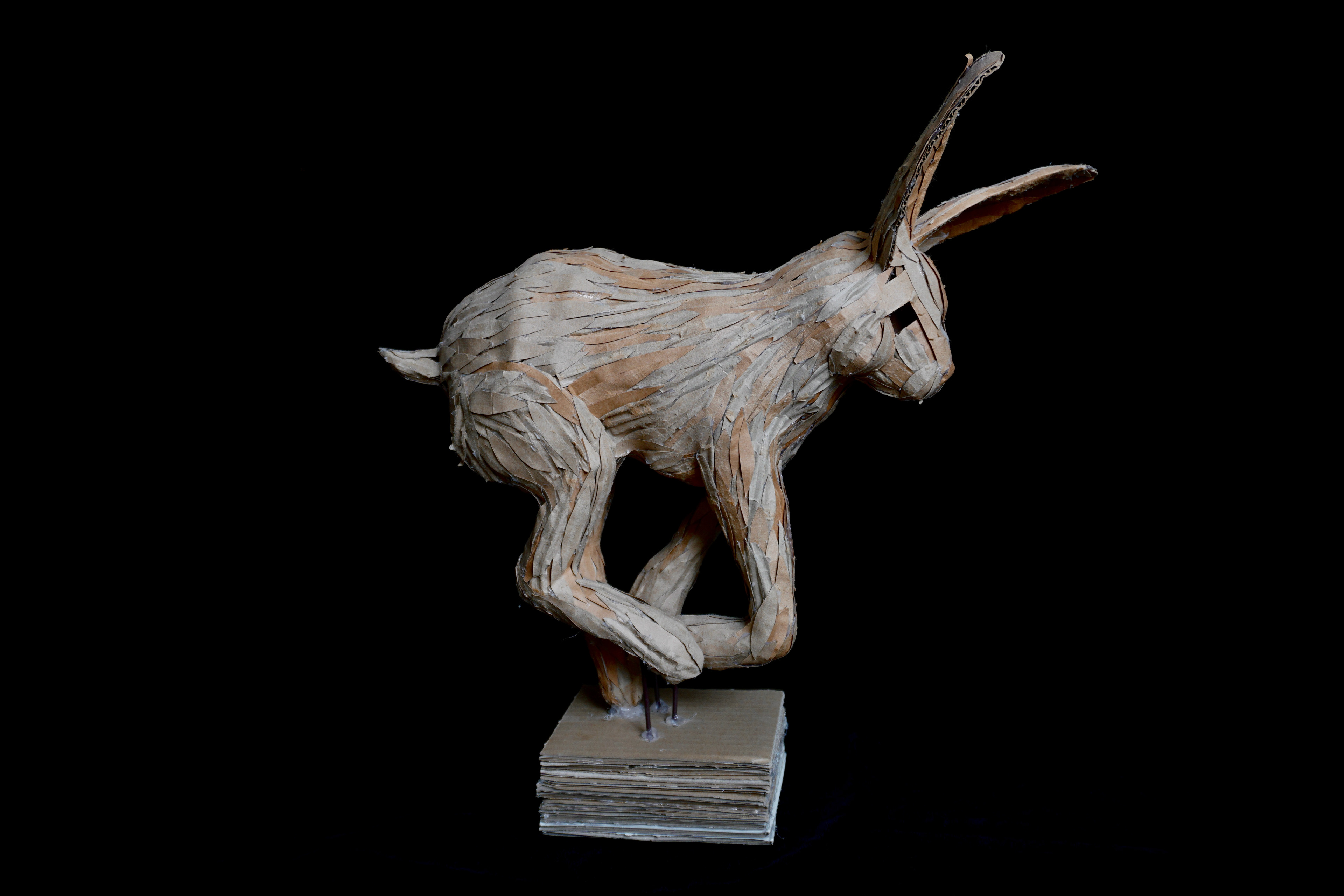 Hares have a superpower—they can use their incredible speed to evade capture by predators exponentially larger than themselves. The nature of a hare intrigued me. While cheetahs are often deemed as being the fastest animal, I wanted to spotlight the unique qualities that hares have, especially the structure of their rear legs, that enable their daring escapes. While at home during the pandemic, I gradually collected cardboard from the refuse room in my apartment building. Using the found material, I constructed a cardboard skeleton for the hare and proceeded to peel apart the layers in the cardboard to create a variation of texture—smooth and corrugated. This made the fur a more convincing texture as I worked to capture the movement of the hare in a 3-D format.
